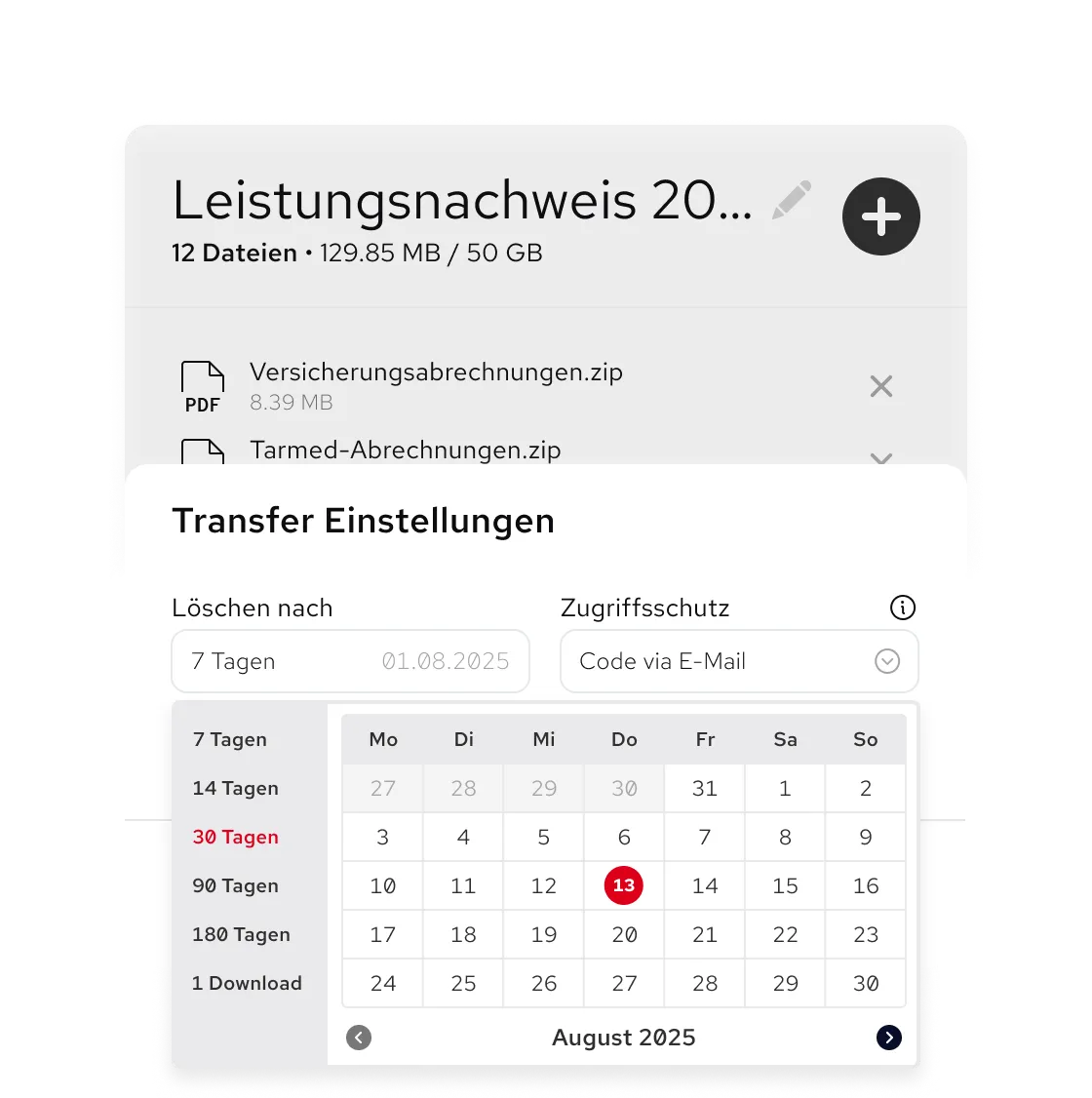 Sicherheit mit Verfallsdatum. Legen Sie fest, wann sensible Daten automatisch gelöscht werden - nach Datum oder erstem Zugriff. Vollautomatisch, DSG/DSGVO-konform und ohne Rückstände.
