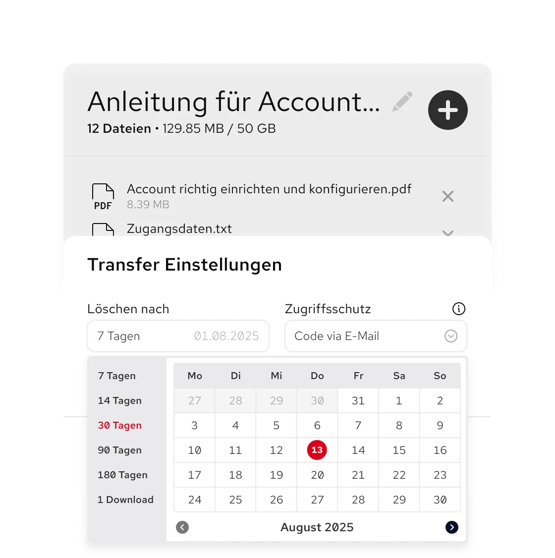 Sicherheit mit Verfallsdatum. Legen Sie fest, wann sensible Daten automatisch gelöscht werden - z.B. nach Ablaufdatum oder erstem Zugriff. Vollautomatisch, DSG-/DSGVO-konform und endgültig.