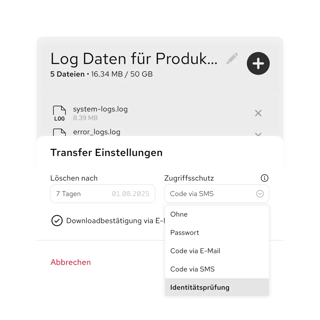 Identitätsprüfung, 2FA Code oder Passwort. Für jeden Transfer wählen Sie den passenden Schutz. So sichern Sie vertrauliche Inhalte und entscheiden selbst, wer Zugriff hat - niemand sonst.